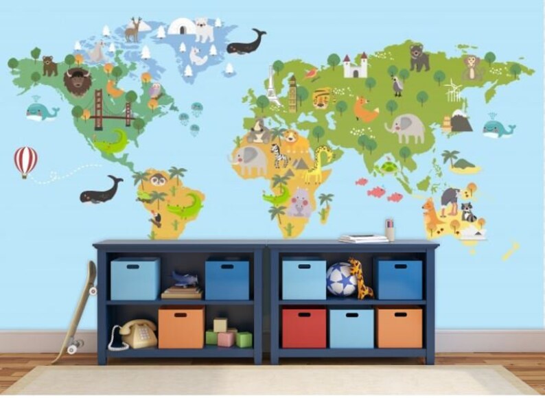 World Map Wallpaper Children World Map Kids World Map Wall Decal World Map Wall Mural Education World Map Nursery World Map