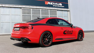 Remus axle back performance exhaust for the rs5 coupe cabrio type 8t increases in horsepower wheel torque deep sonorous racing sound dyno tuned awesome appearance stainless steel construction made in austria free shipping to continental us locations.